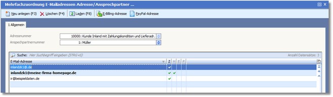 << Hier KLicken um eine Inhaltsübersicht anzuzeigen >> Navigation: Finanzbuchhaltung > Stammdaten > Personenkonten > Die Karteikarte "Adressauswahl" > Adressen erfassen/ändern > Ansprechpartner erfassen/ändern > Weitere eMail-Adressen |