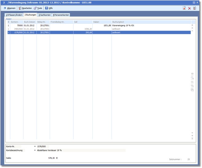 Diese Karteikarte enthält das sogenannte "Stapeljournal", welches alle erfassten Buchungen des Stapels enthält. Die Buchungen können im Stapeljournal noch bearbeitet werden.