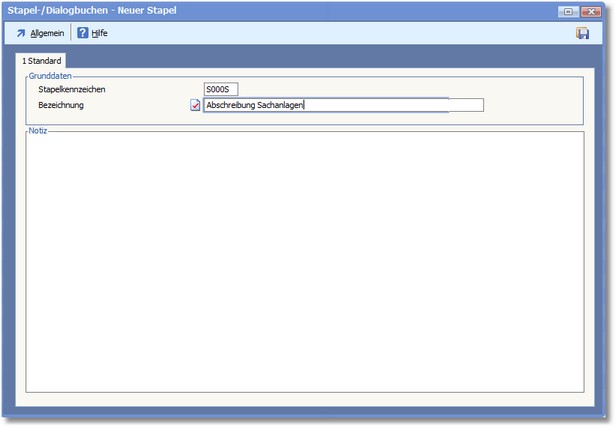 1. Öffnen Sie den Buchungsbereich über das Hauptmenü „Finanzbuchhaltung > Stapelbuchungen". Das Programm öffnet zunächst die Stapelauswahl mit der Karteikarte "Buchungen". 2. Aktivieren Sie hier die Karteikarte "Schablonen" und drücken Sie [F3], um einen neuen Stapel zu erfassen. 3. Legen Sie eine BEZEICHNUNG für den Stapel fest und speichern Sie Ihre Eingaben mit [F10]. 4. Starten Sie den Stapel mit [RETURN] und erfassen Sie die Buchung als normale Aufteilungsbuchung. 5. Nach kompletter Aufteilung bestätigen Sie die nachfolgende Abfrage nach der Verbuchung mit <ja>. 6. Nach der Verbuchung legen Sie eine Bezeichnung für die soeben erstellte Buchungsschablone fest und speichern Sie diese Eingabe mit [F10].