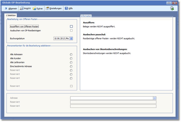 << Hier KLicken um eine Inhaltsübersicht anzuzeigen >> Navigation: Finanzbuchhaltung > Laufende Vorgänge > OP-Verwaltung > Funktionen vorheriger Versionen > Globale OP-Bearbeitung |