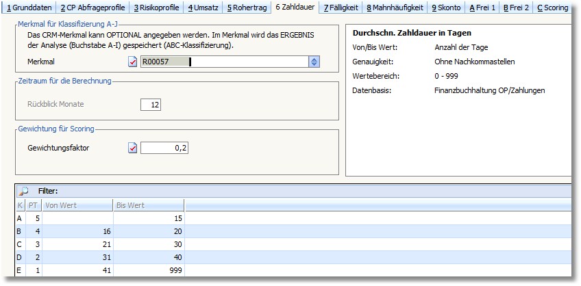 Durchschn. Zahldauer -> gewichtet mit 0 / fließt überhaupt nicht in die Bonitätseinstufung ein, weil diese auf Grund der Zahlungskondition für die Bonität nicht aussagekräftig genug ist (für eine ABC-Analyse nach Zahldauer aber sehr wohl ->"ABC-Kunden nach Zahldauer").