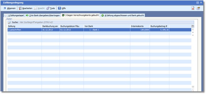 << Hier KLicken um eine Inhaltsübersicht anzuzeigen >> Navigation: Finanzbuchhaltung > Laufende Vorgänge > Zahlungsverkehr > Zahlungseingang > Die Karteikarte "Gegen Verrechnungskonto gebucht" |