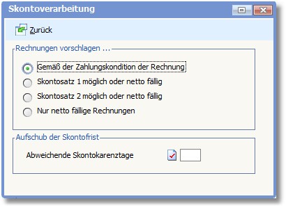 << Hier KLicken um eine Inhaltsübersicht anzuzeigen >> Navigation: Finanzbuchhaltung > Laufende Vorgänge > Zahlungsverkehr > Zahlungsausgang > Die Karteikarte "Zahlungsstapel" > Neuen Zahlungsstapel anlegen > Neuen Zahlungsstapel anlegen - Menü > Skontoverarbeitung |