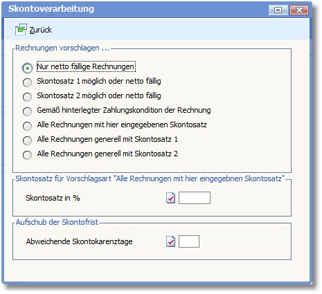 << Hier KLicken um eine Inhaltsübersicht anzuzeigen >> Navigation: Finanzbuchhaltung > Laufende Vorgänge > Zahlungsverkehr > Zahlungseingang > Die Karteikarte "Zahlungsstapel" > Neuen Zahlungsstapel anlegen > Neuen Zahlungsstapel anlegen - Menü > Skontoverarbeitung |