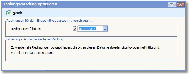 << Hier KLicken um eine Inhaltsübersicht anzuzeigen >> Navigation: Finanzbuchhaltung > Laufende Vorgänge > Zahlungsverkehr > Zahlungseingang > Die Karteikarte "Zahlungsstapel" > Neuen Zahlungsstapel anlegen > Neuen Zahlungsstapel anlegen - Menü > Zahlungsvorschlag optimieren |