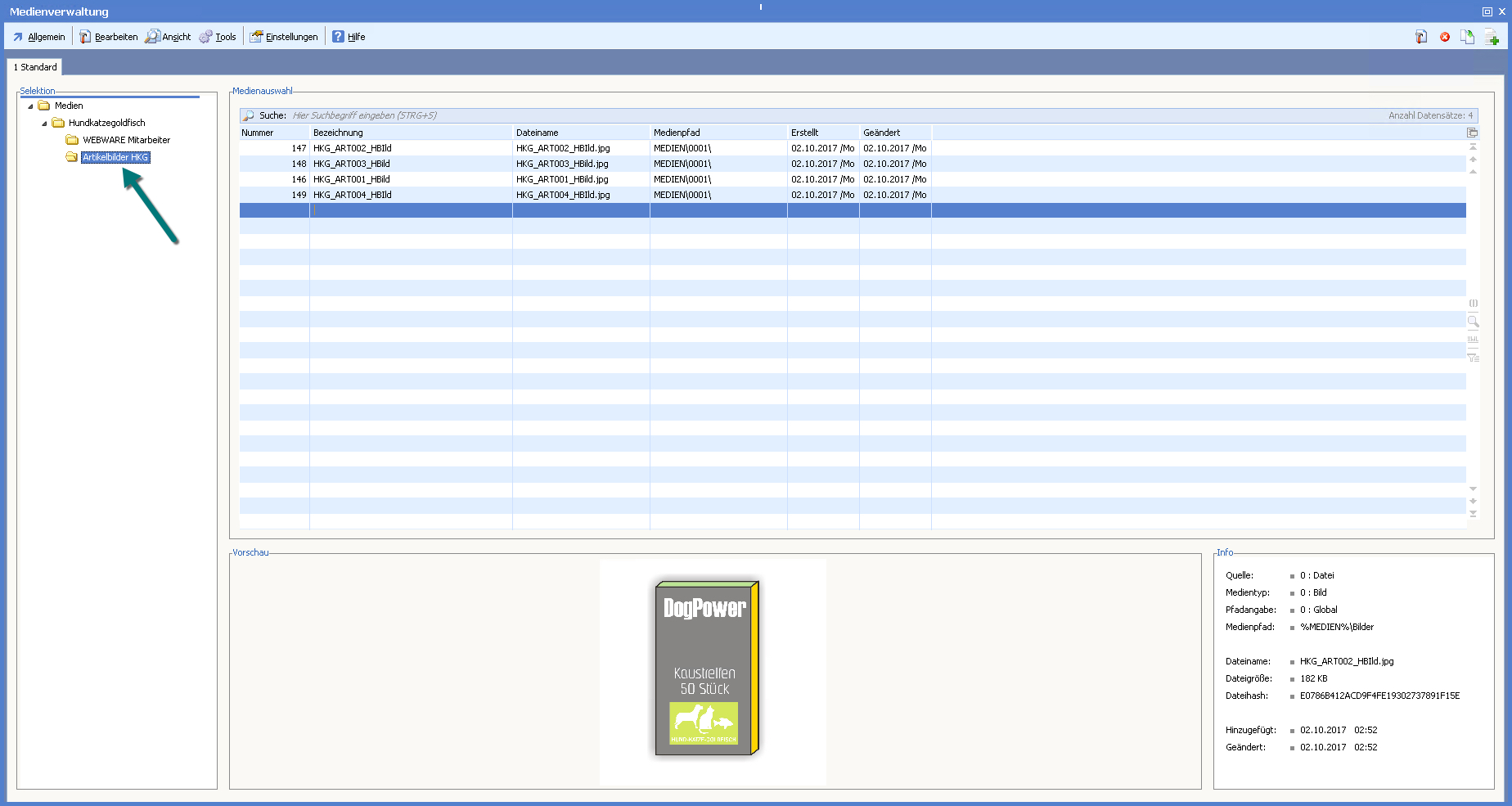 Öffnen Sie die Artikelstammdaten und starten Sie im Menü „Extras“ die „Medienverwaltung“.