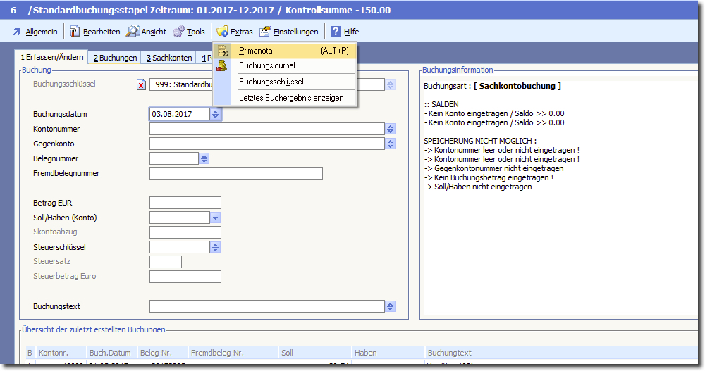 ➜ Eine weitere Möglichkeit ist die Primanota. Diese finden Sie (bei aktiver Registerkarte "Buchen") im Menü "Extras".
