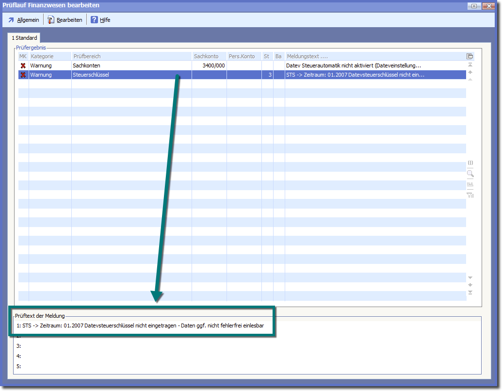 Ist bei einem Steuerschlüssel kein DATEV-Steuerschlüssel eingetragen, erfolgt die entsprechende Fehlermeldung.
