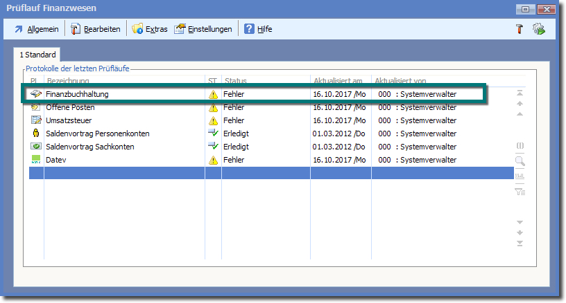 << Hier KLicken um eine Inhaltsübersicht anzuzeigen >> Navigation: Finanzbuchhaltung > Monatliche/periodische Arbeiten > Finanzbuchhaltung prüfen > Prüflauffehler und deren Bearbeitung > Fehler im Finanzbuchhaltungsprüflauf |