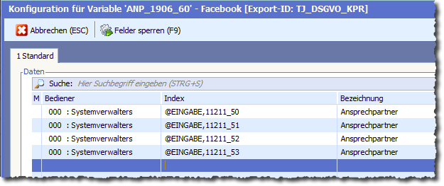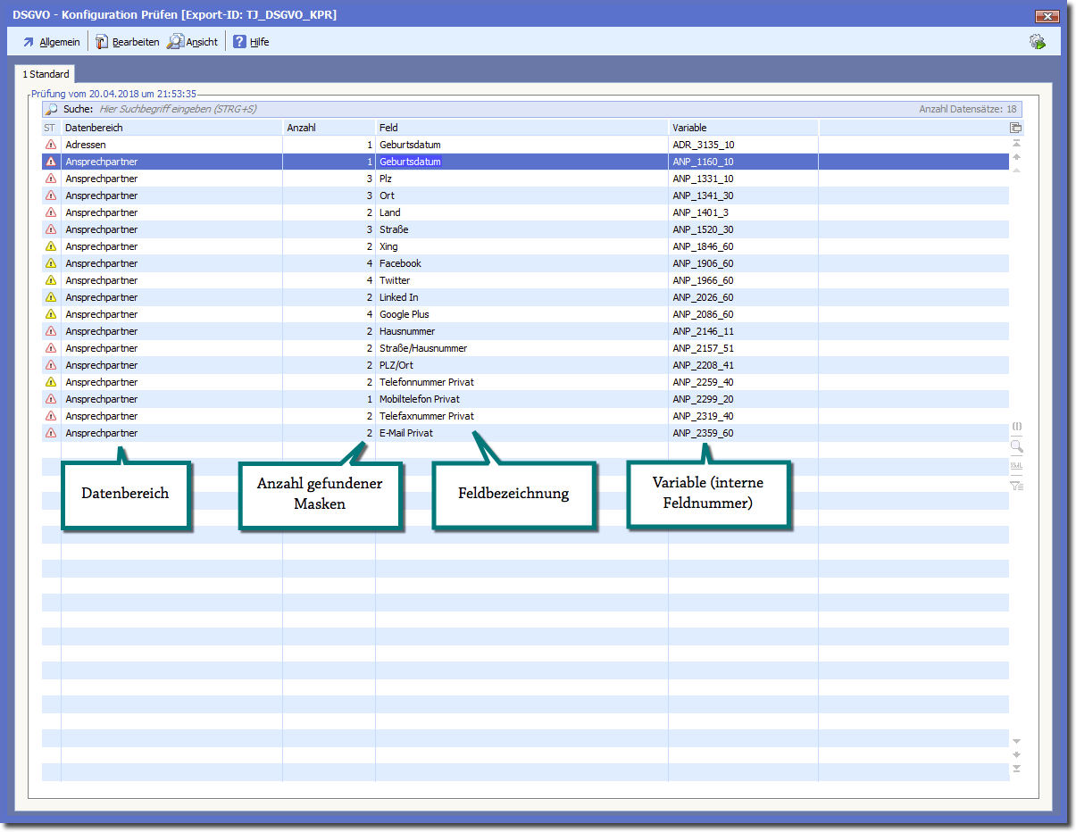 Unter dem Punkt „Konfiguration prüfen“ werden die Masken der Datenbereiche „Ansprechpartner“ und „Adressen“ noch den kritischen Feldern geprüft und die Fundstellen (der Maskenindex der betreffenden Maske) angezeigt.