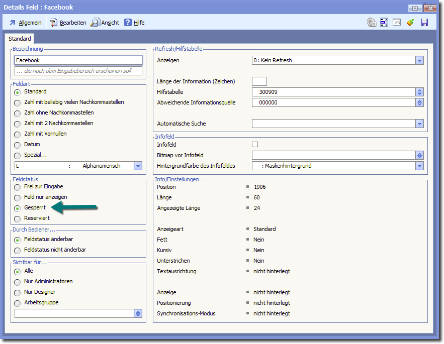 Somit ist auch die einfach Möglichkeit gegeben, ein versehentlich gesperrtes Feld wieder an der ursprünglichen Stelle sichtbar zu machen (Designerberechtigung, entsprechende Kenntnisse und Lizenz vorausgesetzt).