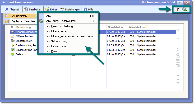 Dafür können Sie das Menü "Allgemein ➔ Aktualisieren" oder eines der Quicktools (rechts oben in der Menüleiste) benutzen.