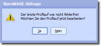Ist ein Prüflauf durchgeführt worden, der Fehler erkannte, erhalten Sie immer beim Öffnen der Stapelauswahl eine entsprechende Meldung.
