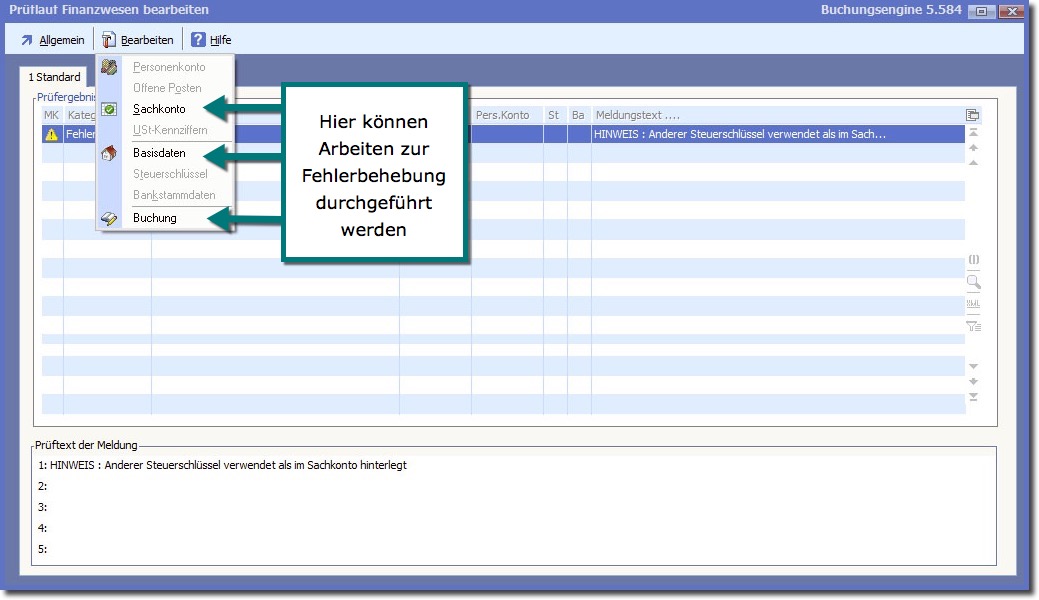 << Hier KLicken um eine Inhaltsübersicht anzuzeigen >> Navigation: Finanzbuchhaltung > Monatliche/periodische Arbeiten > Finanzbuchhaltung prüfen > Prüflauffehler und deren Bearbeitung |
