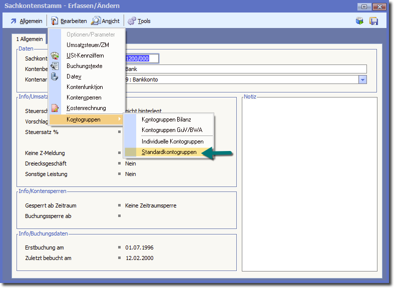 Öffnen Sie die Stammdaten des Sachkontos (Menü "Bearbeiten ➔ Sachkonto").