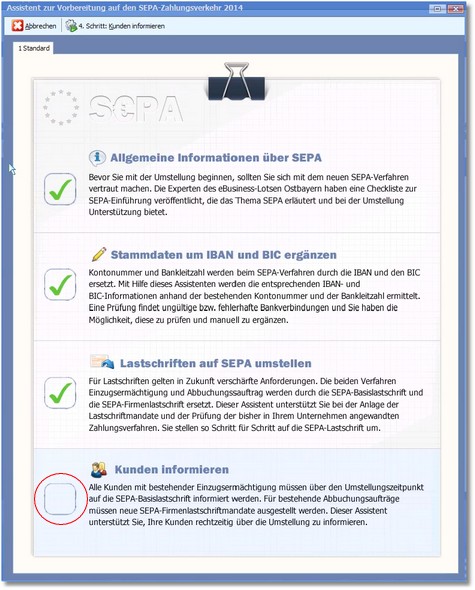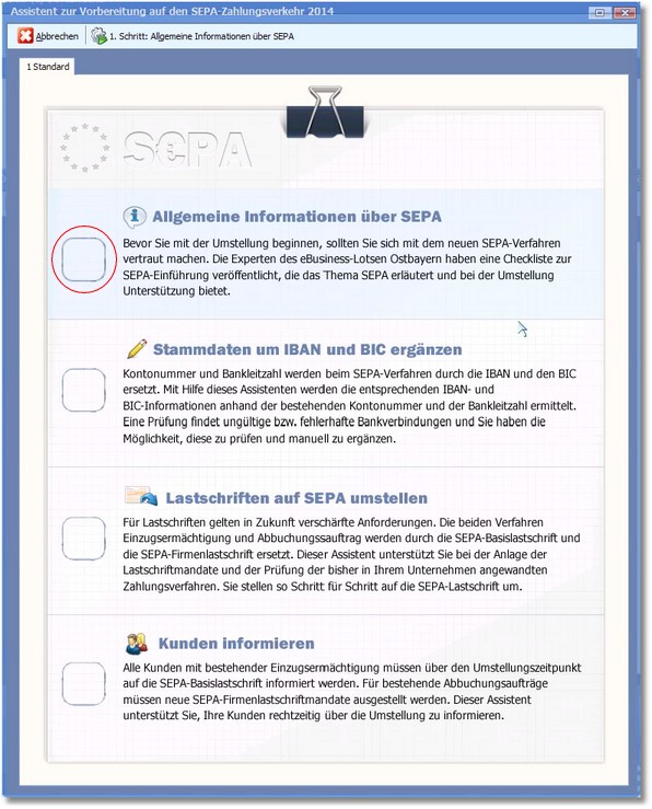 Dieser Assistent unterstützt sie bei der Umsetzung auf den SEPA-Zahlungsverkehr und ist über das Dashboard aufzurufen.