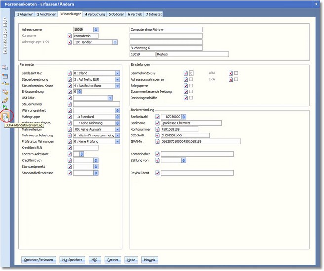 2. Klicken Sie in der ERP-Leiste des Personenkontos auf den Symbolbutton "SEPA-Mandatsverwaltung".