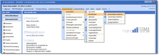 1. Klicken Sie im Hauptmenü auf "Kostenrechnung > Stammdaten > Einstellungen > Kostenstellenschablonen".