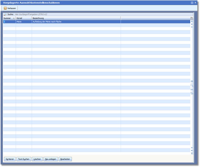 Das Programm öffnet die vorgelagerte Auswahltabelle der Kostenstellenschablonen.