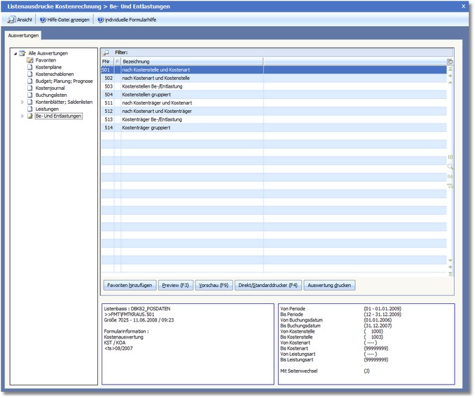 Das Programm die vorgelagerte Auswahl der Listenausdrucke Kostenrechnung.