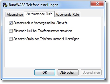 << Hier KLicken um eine Inhaltsübersicht anzuzeigen >> Navigation: CRM/OfficePlaner > Telekommunikation/BüroWARE Phone > Einstellungen für ankommende Anrufe |