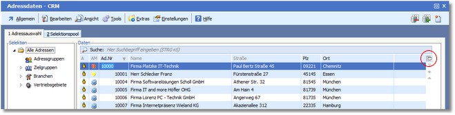 1. Klicken Sie mit der Maus auf den Button <Bearbeiten> in der Symbolleiste. 2. Im Auswahlmenü klicken Sie mit der Maus auf den Eintrag "Tabelle in Selektionspool überstellen". 3. Das Programm überträgt Kopien aller Adressen in den Selektionspool.