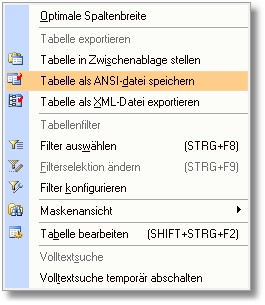 2. Im Auswahlmenü klicken Sie mit der Maus auf den Eintrag "Tabelle als XML-Datei exportieren".