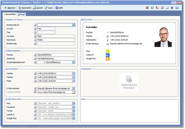 Hier werden die gespeicherten Daten des Ansprechpartners in Visitenkartenform dargestellt.