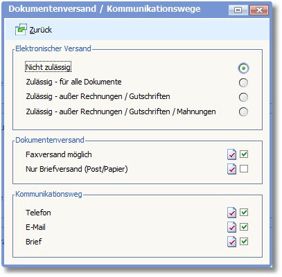 << Hier KLicken um eine Inhaltsübersicht anzuzeigen >> Navigation: CRM/OfficePlaner > Stammdaten > Adressstamm > Adressen erfassen/ändern > Die Karteikarte "Standard" (Firma) > Dokumentenversand / Kommunikationswege |