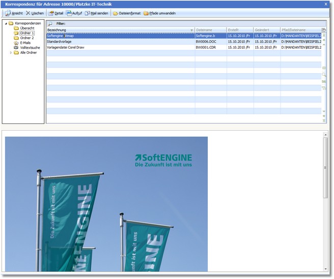 Die Auswahltabelle zeigt den Inhalt des in der Baumauswahl markierten Ordners an. Sie sehen eine Liste der Korrespondenzdateien, die mit der Adresse verknüpft sind.
