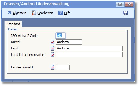 << Hier KLicken um eine Inhaltsübersicht anzuzeigen >> Navigation: CRM/OfficePlaner > Stammdaten > Basisdaten > Länderverwaltung > Länder erfassen/ändern > Die Karteikarte "Standard" |