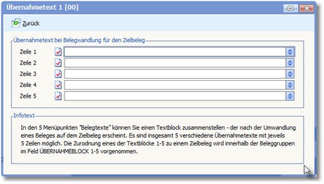 Mit den Menüfunktionen Übernahmetexte 1 -5 können Sie jeweils einen Textblock zusammenstellen, der nach der Umwandlung eines Beleges auf dem Zielbeleg erscheint. Es sind also insgesamt 5 verschiedene Übernahmetexte mit jeweils 5 Zeilen möglich. Die Zuordnung eines der Textblöcke 1-5 zu einem Zielbeleg wird im Designer innerhalb der Beleggruppen im Feld ÜBERNAHMEBLOCK 1-5 vorgenommen.