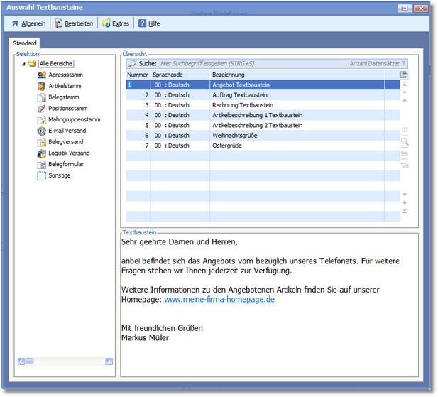 << Hier KLicken um eine Inhaltsübersicht anzuzeigen >> Navigation: CRM/OfficePlaner > Stammdaten > Basisdaten > Textbausteine |