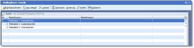 Das Programm öffnet den Dialog "Mailinglisten-Tabelle".