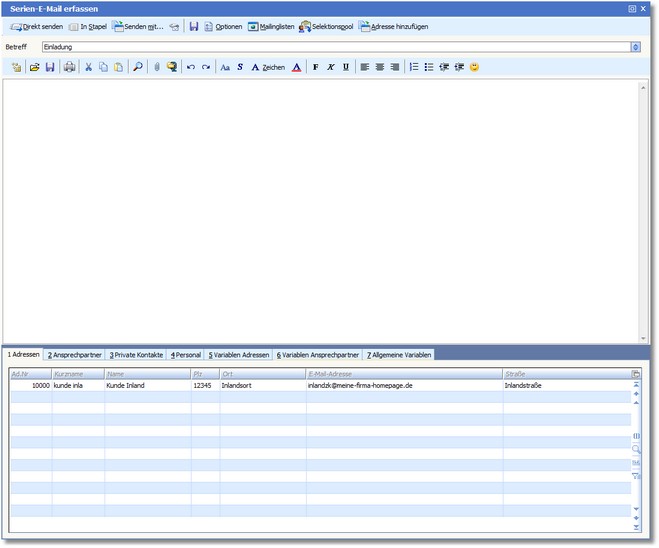 Sie haben die Möglichkeit, in der E-Mail-Nachricht anstelle von Text Variablen aus dem Adress- oder Ansprechpartnerstamm zu verwenden, um die Serien-E-Mails zu personalisieren.