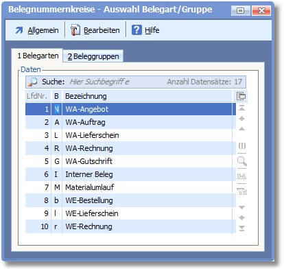 Durch Aktivierung der jeweiligen Karteikarten können Sie die Nummernkreise der Belegarten und Beleggruppen bearbeiten.