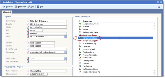 Mit der Länderverwaltung stellt das Programm einen Stammbereich für die Ländertabelle nach dem ISO-ALPHA-II-Code zur Verfügung. Außerdem wird die Speicherung von landesspezifischen Parametern ermöglicht, die bei Zuordnung eines Landes zu einer Adresse in den Kunden- oder Lieferantenstammsatz übernommen werden können. Im Lieferumfang der ERP - Warenwirtschaft befinden sich ca. 200 Länderdaten.