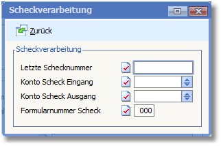 << Hier KLicken um eine Inhaltsübersicht anzuzeigen >> Navigation: Warenwirtschaft > Stammdaten > Basisdaten > Banken > Die Karteikarte "Standard" > Scheckverarbeitung |