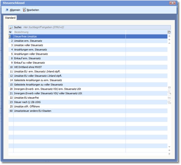 << Hier KLicken um eine Inhaltsübersicht anzuzeigen >> Navigation: Warenwirtschaft > Stammdaten > Basisdaten > Steuerschlüssel |
