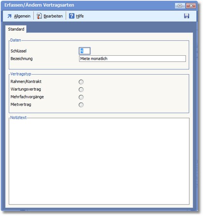 << Hier KLicken um eine Inhaltsübersicht anzuzeigen >> Navigation: Warenwirtschaft > Stammdaten > Basisdaten > Vertragsarten > Die Karteikarte "Standard" |