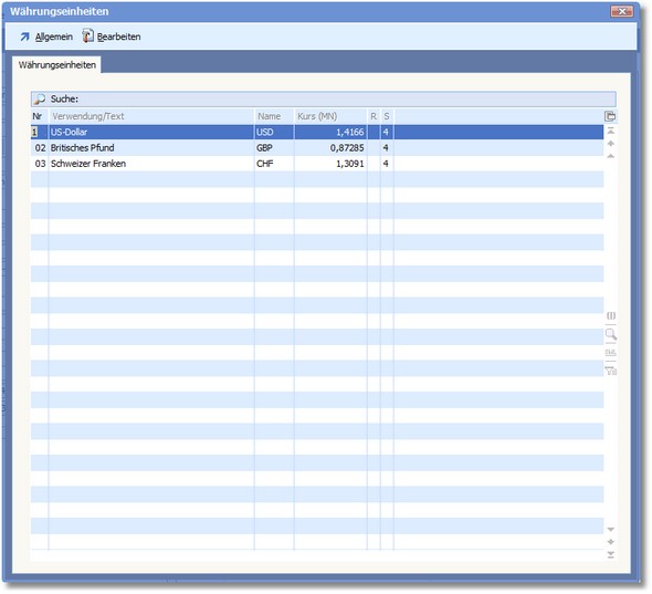 Das Programm öffnet die vorgelagerte Auswahltabelle der Währungseinheiten.