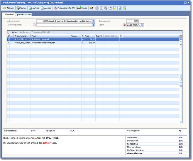 << Hier KLicken um eine Inhaltsübersicht anzuzeigen >> Navigation: Warenwirtschaft > Belegbearbeitung > Warenkorb > Belegerfassung mit dem Warenkorb |