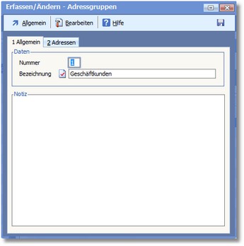 << Hier KLicken um eine Inhaltsübersicht anzuzeigen >> Navigation: CRM/OfficePlaner > Stammdaten > Adressstamm > Adressstamm - Menü > Adressgruppen > Die Karteikarte "Allgemein" |