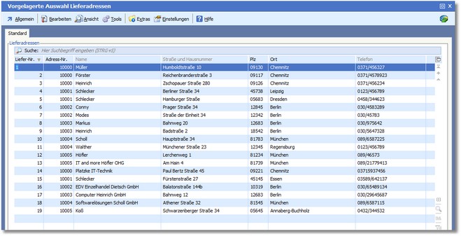 Lieferadressen werden in einem eigenen Stamm verwaltet. Somit ist es möglich, für jede Adresse nahezu beliebig viele Lieferadressen zu erfassen.