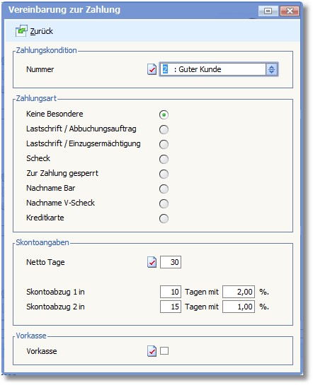 Übernommen werden die innerhalb der Zahlungskondition hinterlegten Tage und die jeweils möglichen Skontoprozentsätze bei Zahlung innerhalb der angegebenen Frist (Tage).