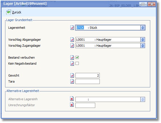 In diesem Feld wird der Faktor eingetragen, mit dem der Wert im Feld ALTERNATIVE LAGEREINHEIT umgerechnet werden soll.