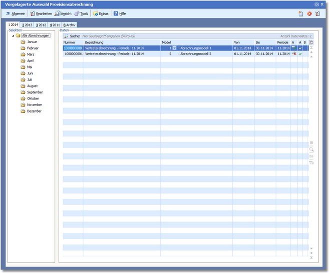 Über diesen Dialog werden die Provisionsabrechnungen erstellt und bearbeitet.