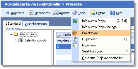 1. Klicken Sie mit der Maus in der Menüleiste der Auswahltabelle Projekte auf den Menüeintrag "Tools > Projektakte".