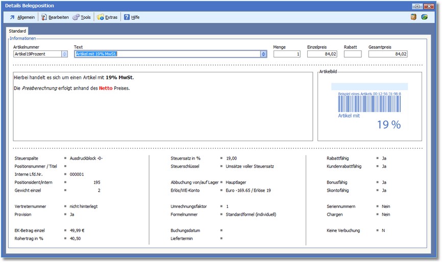 Beachten Sie dabei, dass sich die Änderungen nur auf den in Bearbeitung befindlichen Beleg und nicht auf die Artikelstammdaten auswirken!