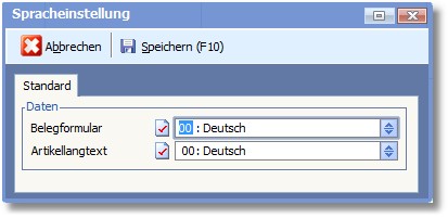 Legen Sie in diesem Dialogfenster für BELEGFORMULAR und ARTIKELLANGTEXT die entsprechende Sprache fest. Mit der Funktionstaste [F5] wird in diesen Feldern jeweils die Auswahltabelle der Sprachen geöffnet.